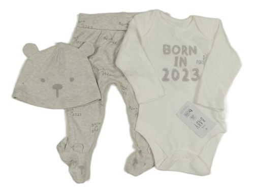 • Nové - 3set - Bílé body s nápisem a číslem + světlešedé melírované polodupky s nápisy + bavlněná čepice