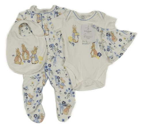 • Nové - 4 set - modro bílo květované body s králíčkem Petrem + modrobílý overal +bryndák + čepice