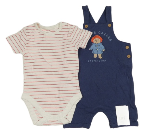 • Nové - 2 set - bílo-červené pruhované body + tmavomodré laclové kraťasy s medvědem George