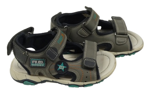 Šedo-tmavomodro-smetanové koženkovo/textilní sandály s nášivkami FIRST UNION vel. 28