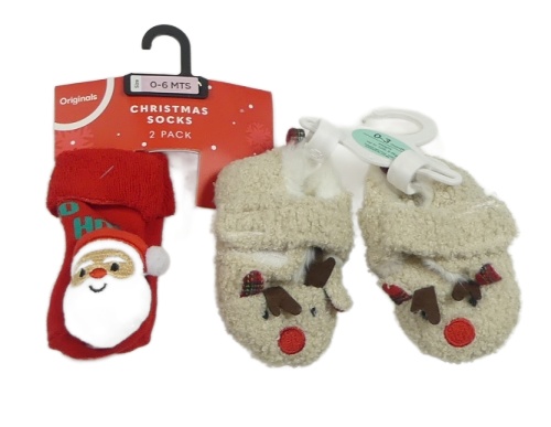 • Nové - 2set - Béžové huňaté zateplené capáčky se sobem vel. 16 + červené ponožky se Santou