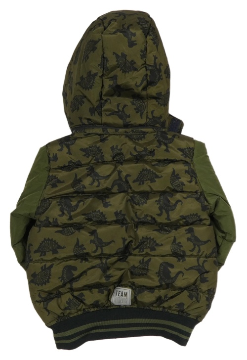 Khaki-černý prošívaný šusťákový zimní bomber s dinosaury a pruhy a odepínací kapucí Kiki&Koko