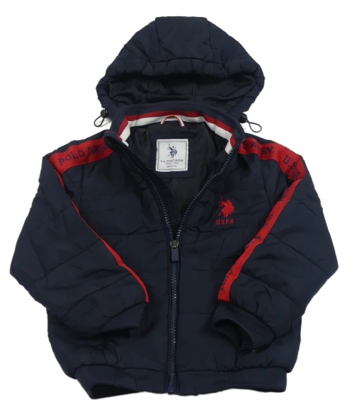 Tmavomodro-červená šusťáková zimní bunda s logem a kapucí US Polo Assn