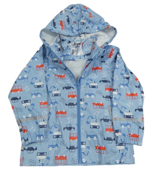 Světlemodrá voděodolná podzimní bunda s auty a nápisy a kapucí Lupilu