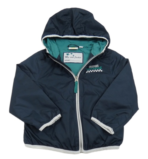 Tmavomodrá šusťáková podzimní bunda s nápisem a kapucí Kids