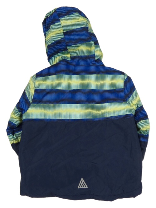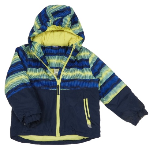 Tmavomodro-safírovo-žlutá šusťáková zimní lyžařská bunda se vzorem a kapucí lupilu