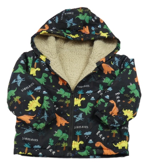 Černá šusťáková zateplená bunda s dinosaury a kapucí Shein