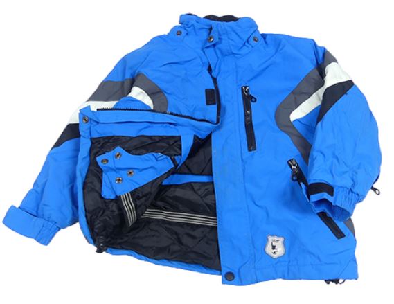 Modro-tmavošedo-bílo-černá šusťáková zimní lyžařská bunda s nášivkou