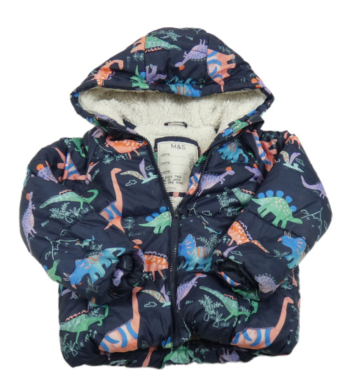 Tmavomodrá šusťáková zimní bunda s dinosaury a kapucí M&S