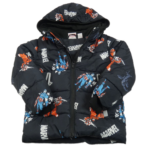 Černá vzorovaná šusťáková zimní bunda s Marvel a kapucí Marvel