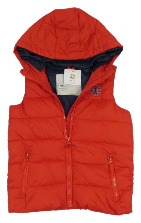 Nové - Červená šusťáková zateplená vesta s nášivkou a kapucí Topolino