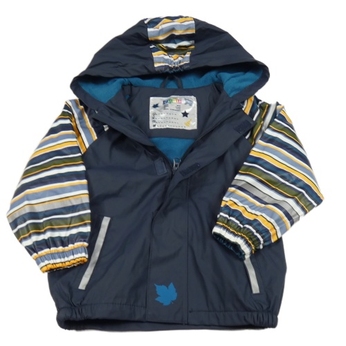Tmavomodrá nepromokavá jarní bunda s barevnými pruhovanými rukávy a kapucí Lupilu