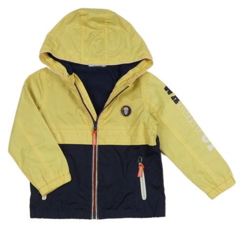 Žluto-tmavomodrá šusťáková lehce zateplená bunda s nášivkou a kapucí Kids