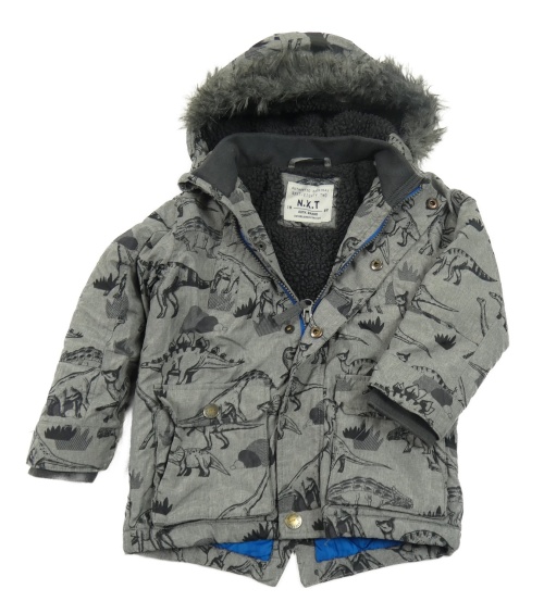 Šedá šusťáková zimní bunda s dinosaury a kapucí Next