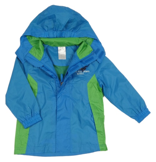 Modro-zelená šusťáková jarní bunda s nápisy a ukrývací kapucí