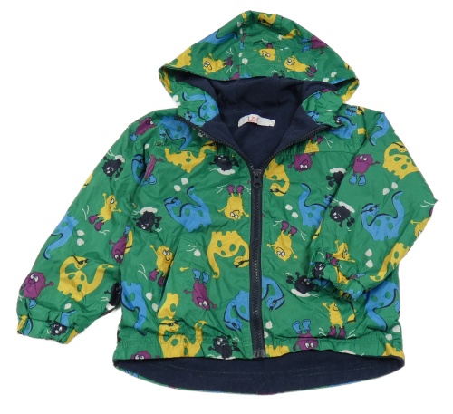 Zeleno-barevná šusťáková jarní bunda s dinosaury a kapucí