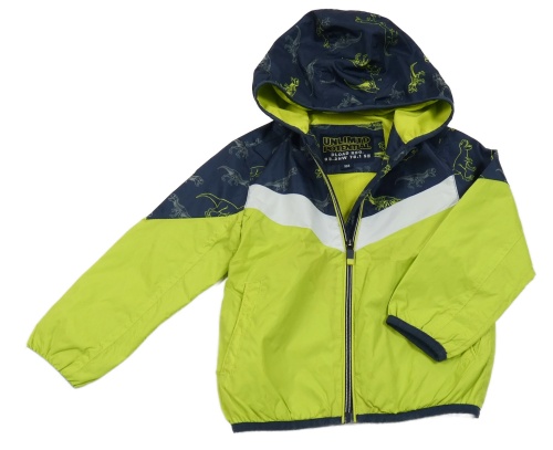 Limetkovo-tmavomodro-bílá šusťáková jarní bunda s dinosaury a kapucí C&A
