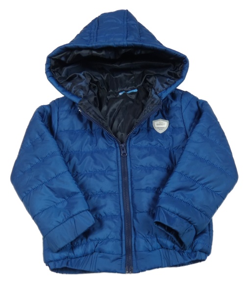 Modrá prošívaná šusťáková zateplená bunda s nášivkou a kapucí