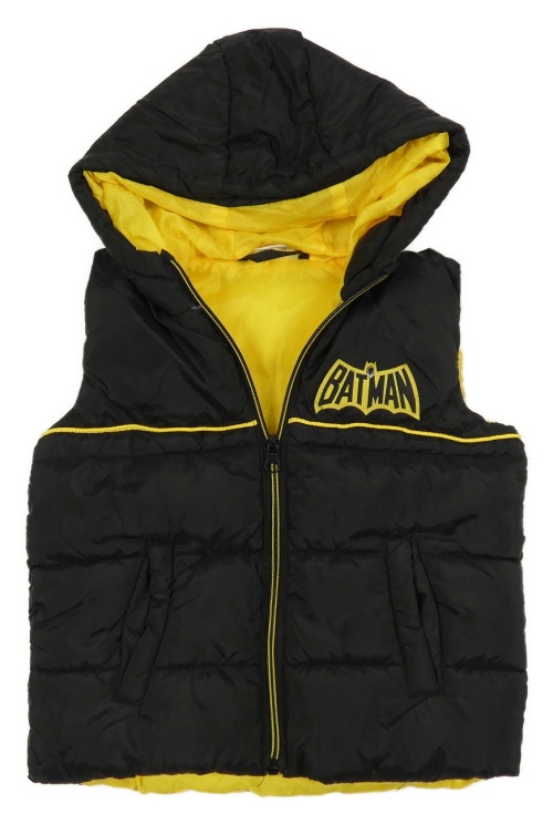 Černo-žlutá šusťáková prošívaná zateplená vesta s Batmanem a kapucí