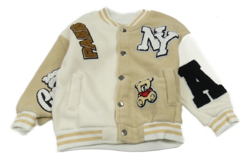 Smetanovo-béžový fleecový baseballový bomber s medvídkem a písmenky a nápisy a pruhy