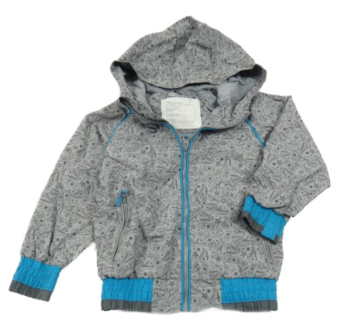 Světlešedo-modrá šusťáková podšitá bunda s obrázky a kapucí