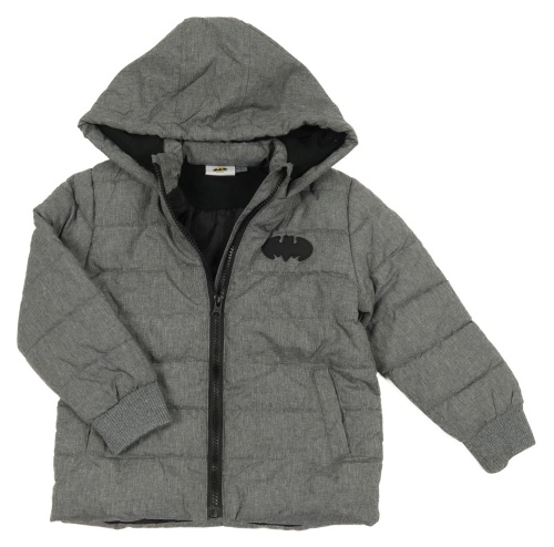 Šedá šusťáková prošívaná zimní bunda s Batmanem a kapucí