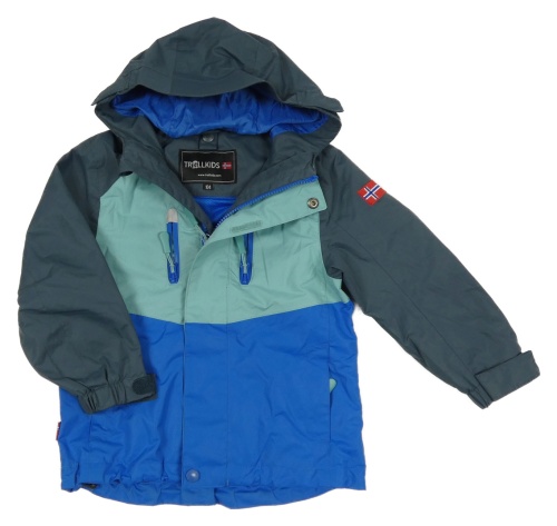 Tmavomodro-zeleno-modrá šusťáková funkční jarní bunda s kapucí trollkids