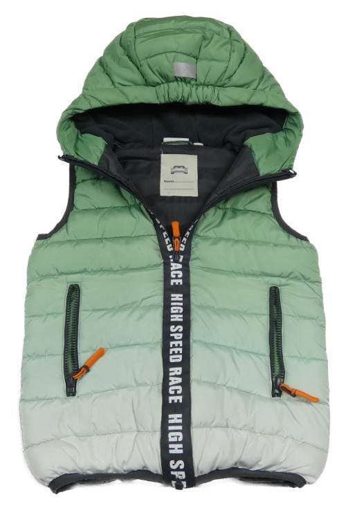 Zeleno-bílá ombré prošívaná šusťáková zateplená vesta s nápisy a kapucí Kids