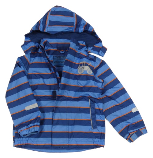Modro-oranžová pruhovaná šusťáková jarní bunda s traktorem a kapucí Impidimpi