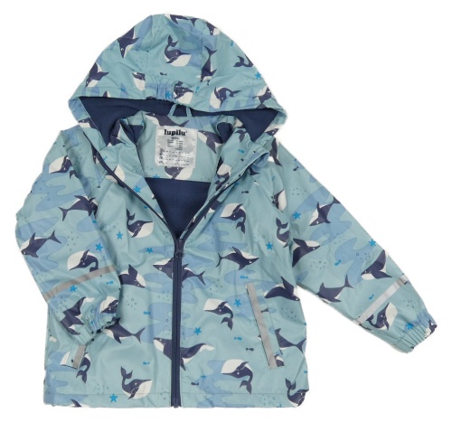 Světlemodrá nepromokavá jarní bunda se žraloky a velrybami a kapucí lupilu