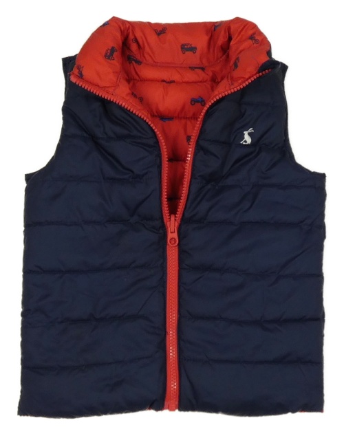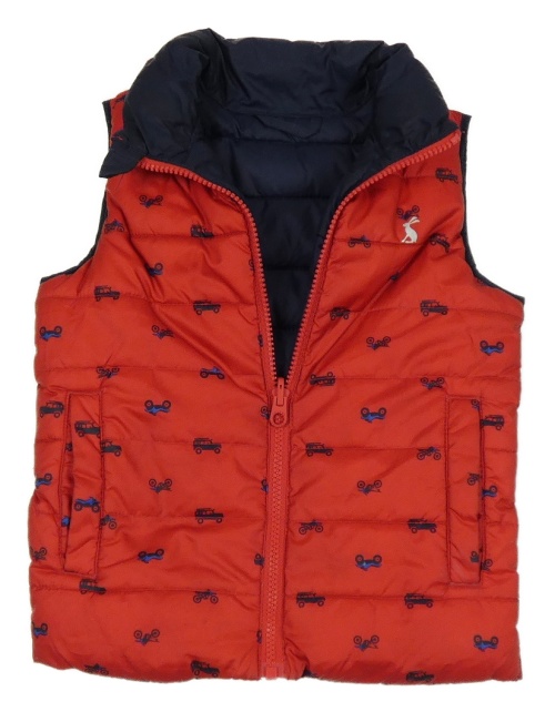 Tmavomodro-červená oboustranná zateplená vesta se zajícem a auty