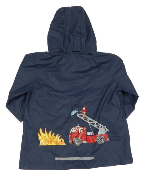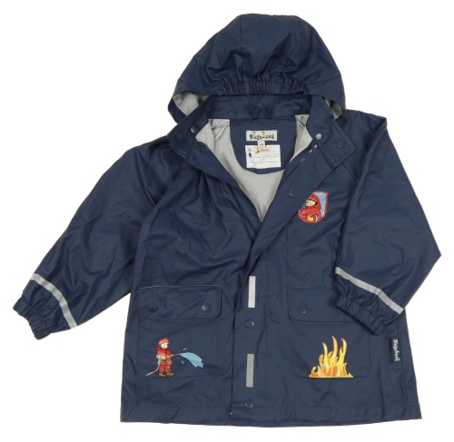 Tmavomodrá voděodolná jarní bunda s hasiči a kapucí