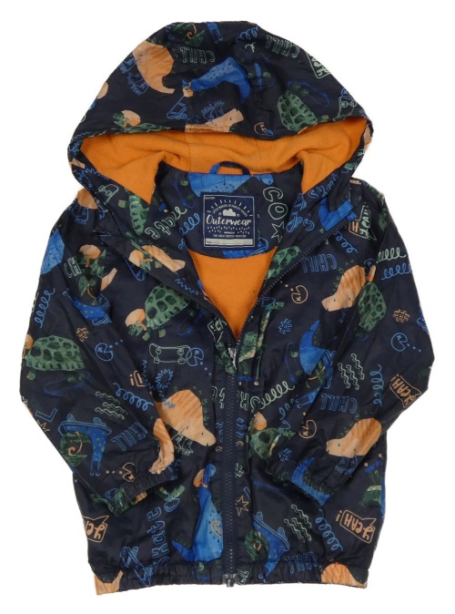 Tmavomodrá šusťáková jarní bunda s dinosaury a želvičkami a skateboardy a kapucí George