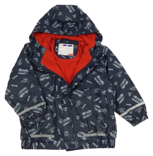 Tmavomodrá nepromokavá podzimní bunda s hasiči a kapucí X-mail