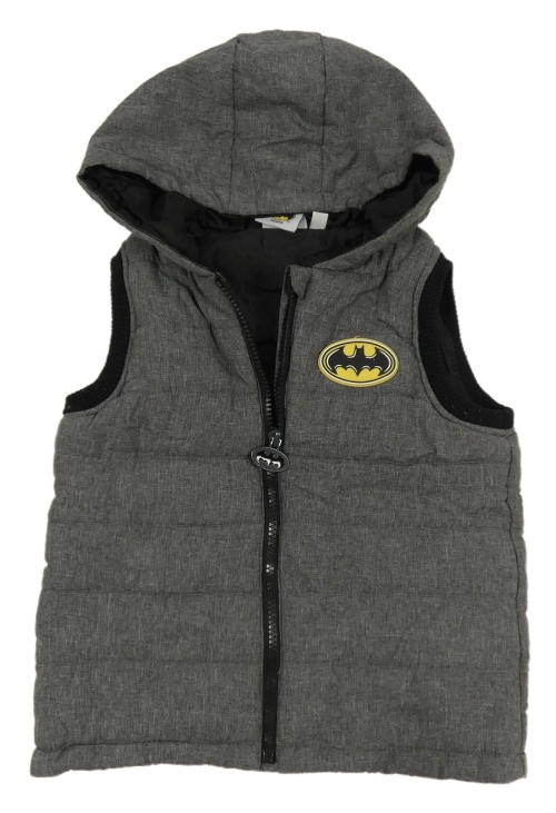 Šedá šusťáková prošívaná zateplená vesta s Batmanem a kapucí z