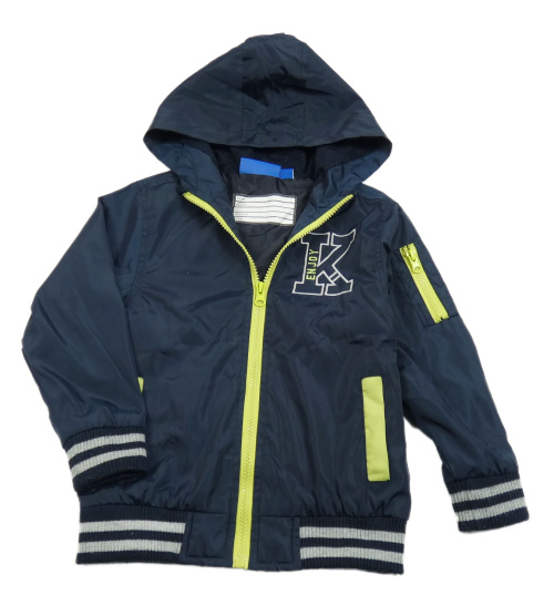 Tmavomodrá šusťáková podzimní bunda s písmenem a kapucí