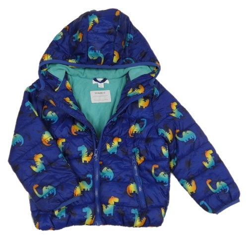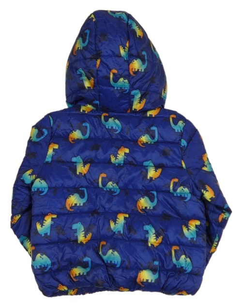 Tmavomodrá prošívaná šusťáková pod/zimní bunda s dinosaury a kapucí M&Co