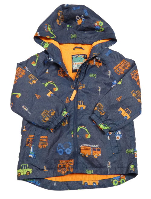 Tmavomodrá melírovaná šusťáková jarní bunda s dopravními prostředky a kapucí F&F