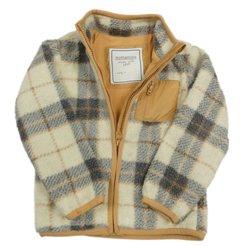 Smetanovo-tmavošedo-hnědá kostkovaná huňatá podšitá bunda s kapsou Mothercare