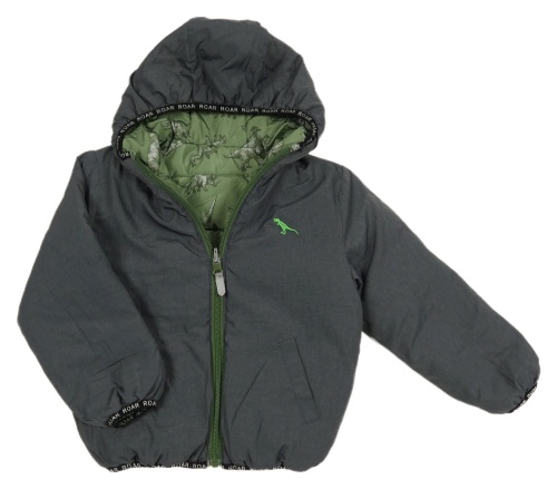 Šedá oboustranná šusťáková zimní bunda s dinem a kapucí