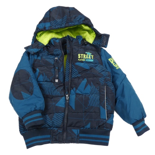 Petrolejovo-černý vzorovaný prošívaný šusťákový přechodový bomber s nápisy a dinosaurem a odepínací kapucí Kiki&Koko