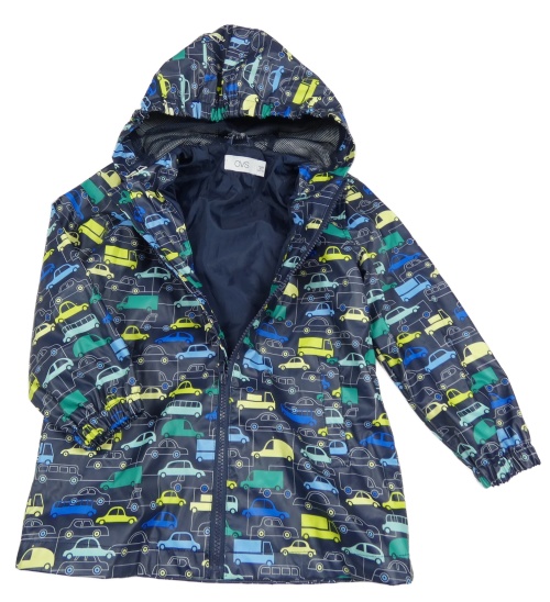 Tmavomodrá nepromokavá jarní bunda s auty a kapucí OVS