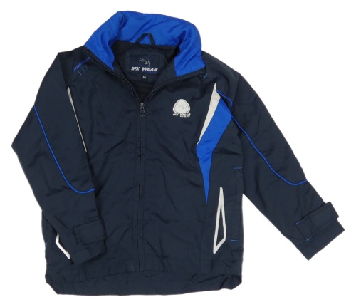 Tmavomodro-modrá šusťáková sportovní bunda s potiskem