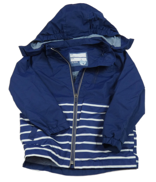 Tmavomodro-bílá pruhovaná šusťáková podzimní bunda s odepínací kapucí Tchibo