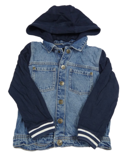 Modrá riflová bunda s tmavomodrými teplákovými rukávy s pruhy a odepínací kapucí Next