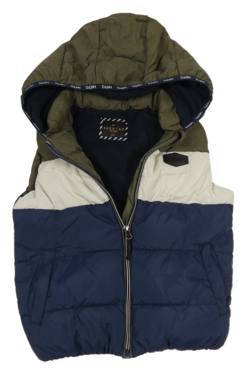 Tmavomodro-khaki-bílá pruhovaná šusťáková zateplená vesta s kapucí Hashtag
