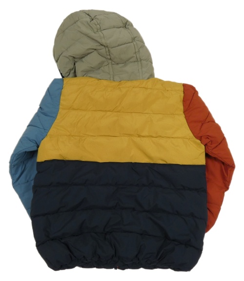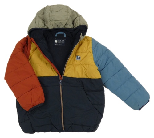 Okrovo-tmavomodrá šusťáková zimní bunda s barevnými rukávy a kapucí Next