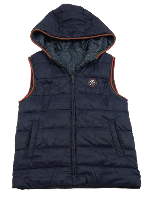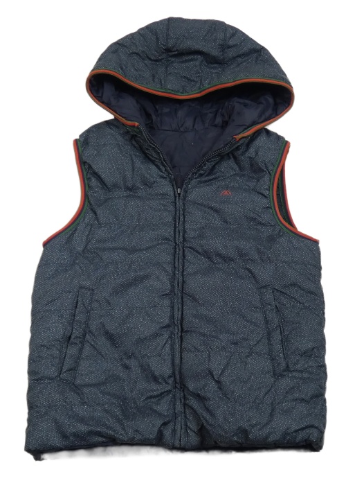 Tmavomodrá šusťáková zateplená oboustranná vesta s nášivkou a kapucí Mayoral