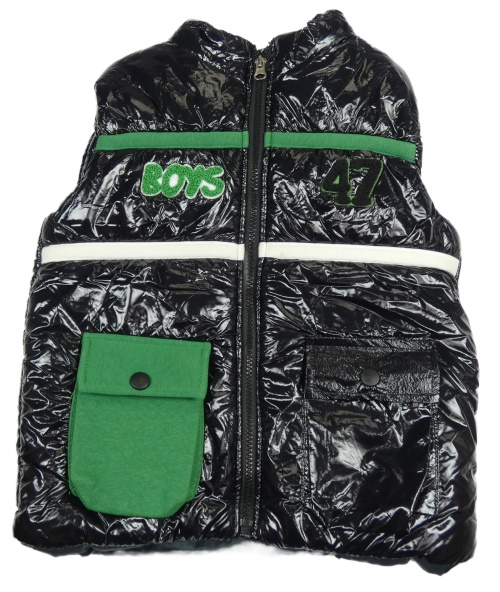 Černá lesklá šusťáková zateplená vesta se zelenou kapsou a nápisem