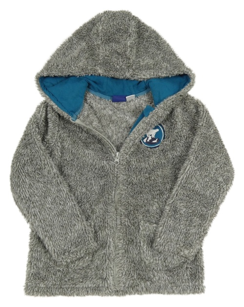 Šedo-bílá melírovaná chlupatá bunda s nášivkou a kapucí lupilu